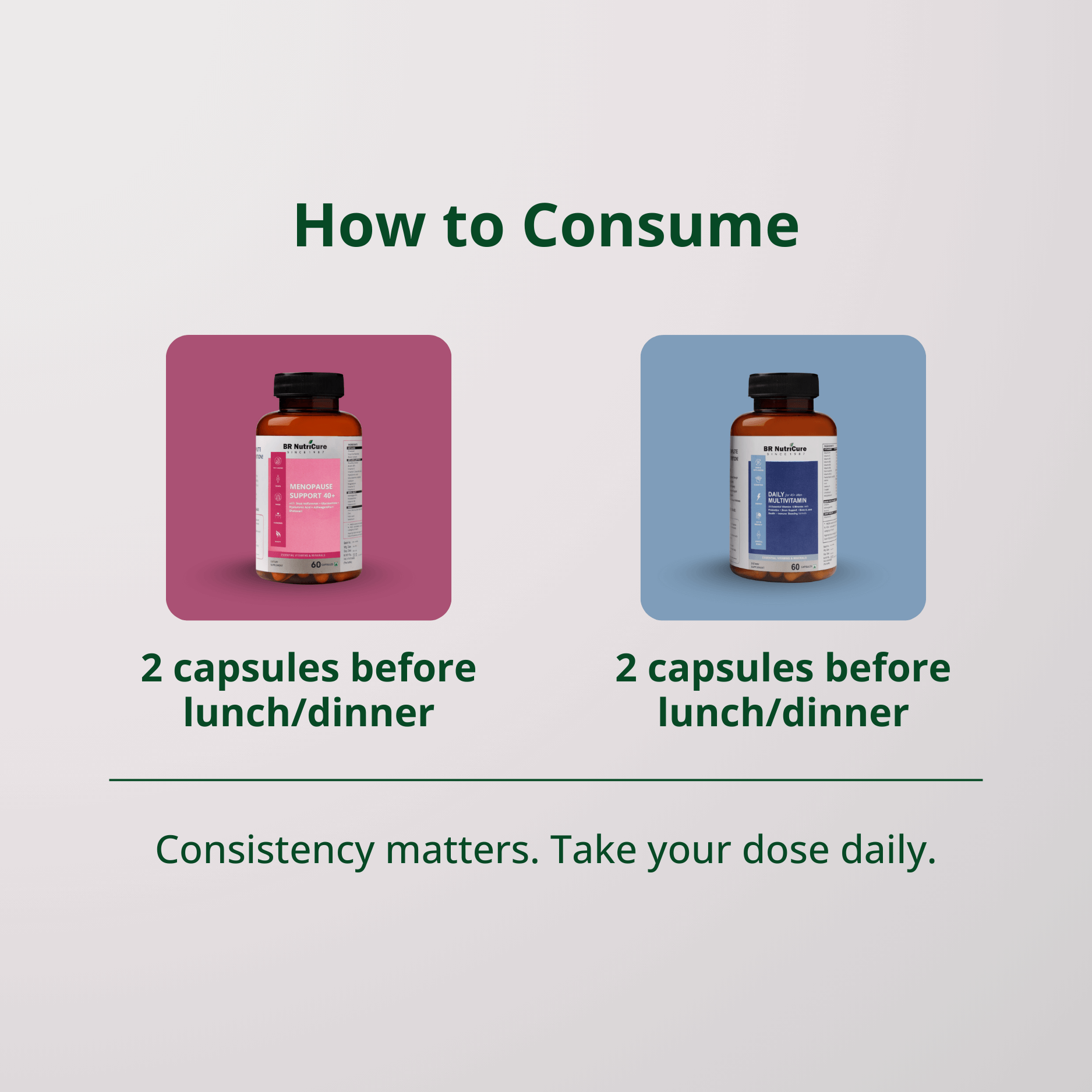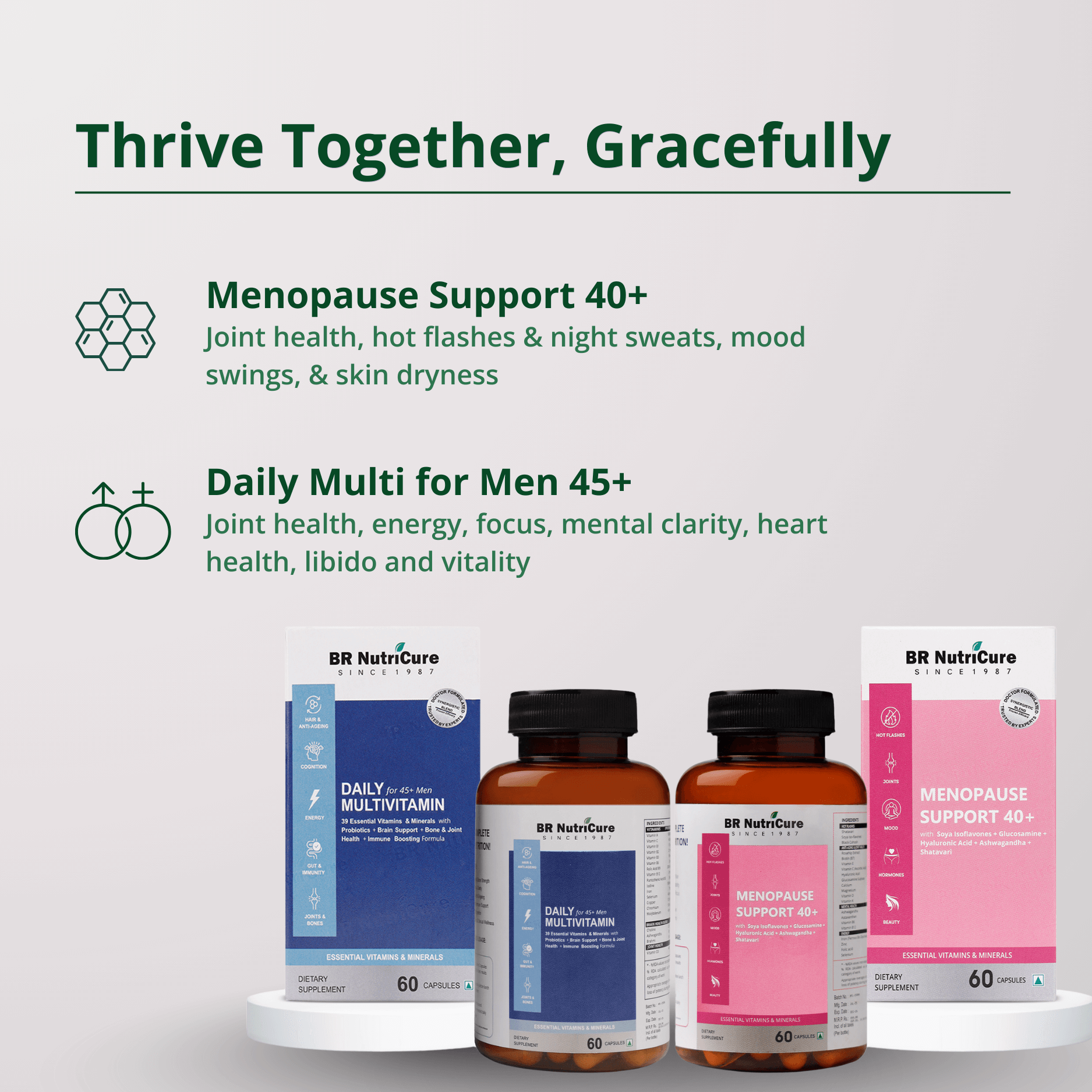 This bundle includes 1 Daily Multi for men 45+ and 1 Menopause Support 40+. Together supporting daily health and vitality for couples in the next phase of their lives.