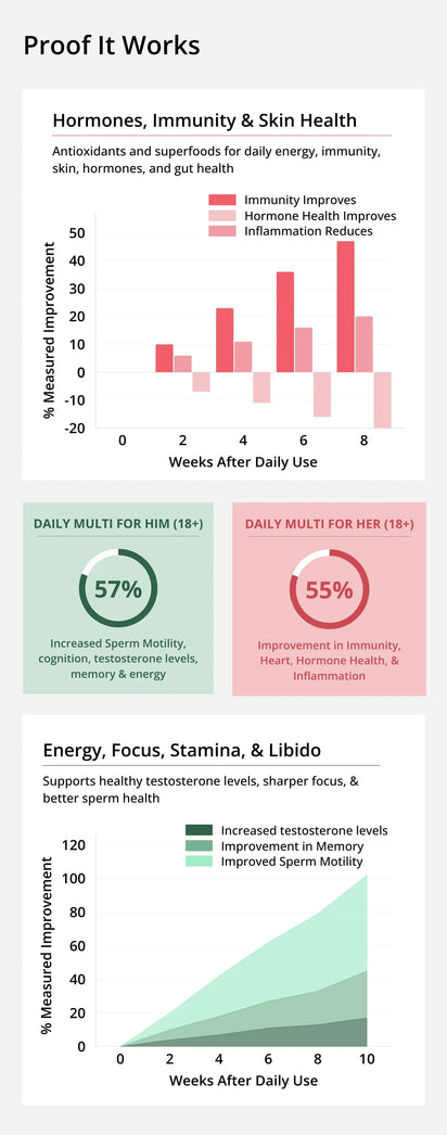 While these are not fertility-specific supplements, the thoughtfully formulated blend of balanced vitamins, minerals, and antioxidants in both formulas support overall health, energy, and hormonal balance , all of which are important for overall reproductive wellness. Taken consistently, they help couples maintain strong, healthy bodies, supporting overall reproductive wellness and long-term fertility potential.