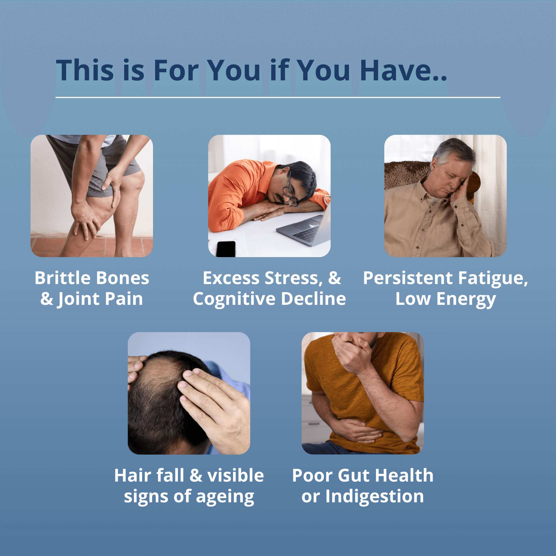 A complete wellness support for the backbone of the family. Meet our science backed formula that restores mobility, energy, stamina & drive to help you feel like yourself again: strong, sharp & full of life.