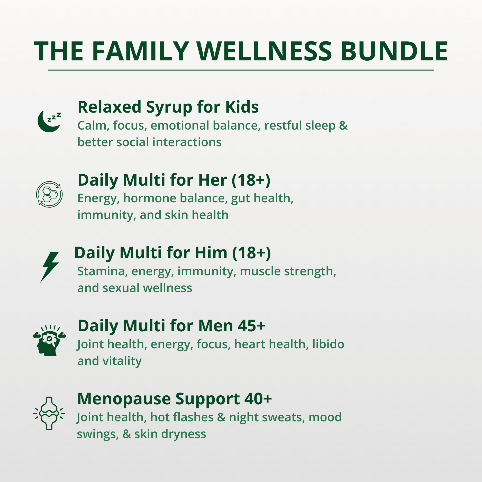 The family bundle includes 5 products: Daily Multi For Him (18+), Daily Multi For Her (18+), Menopause Support 40+, Daily Multi for Men 45+, and Relaxed Syrup for Kids (2–10).
