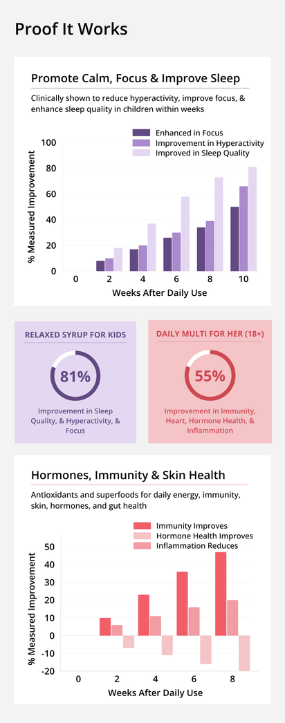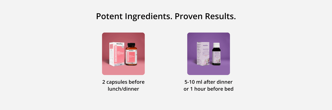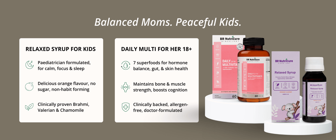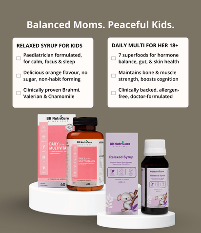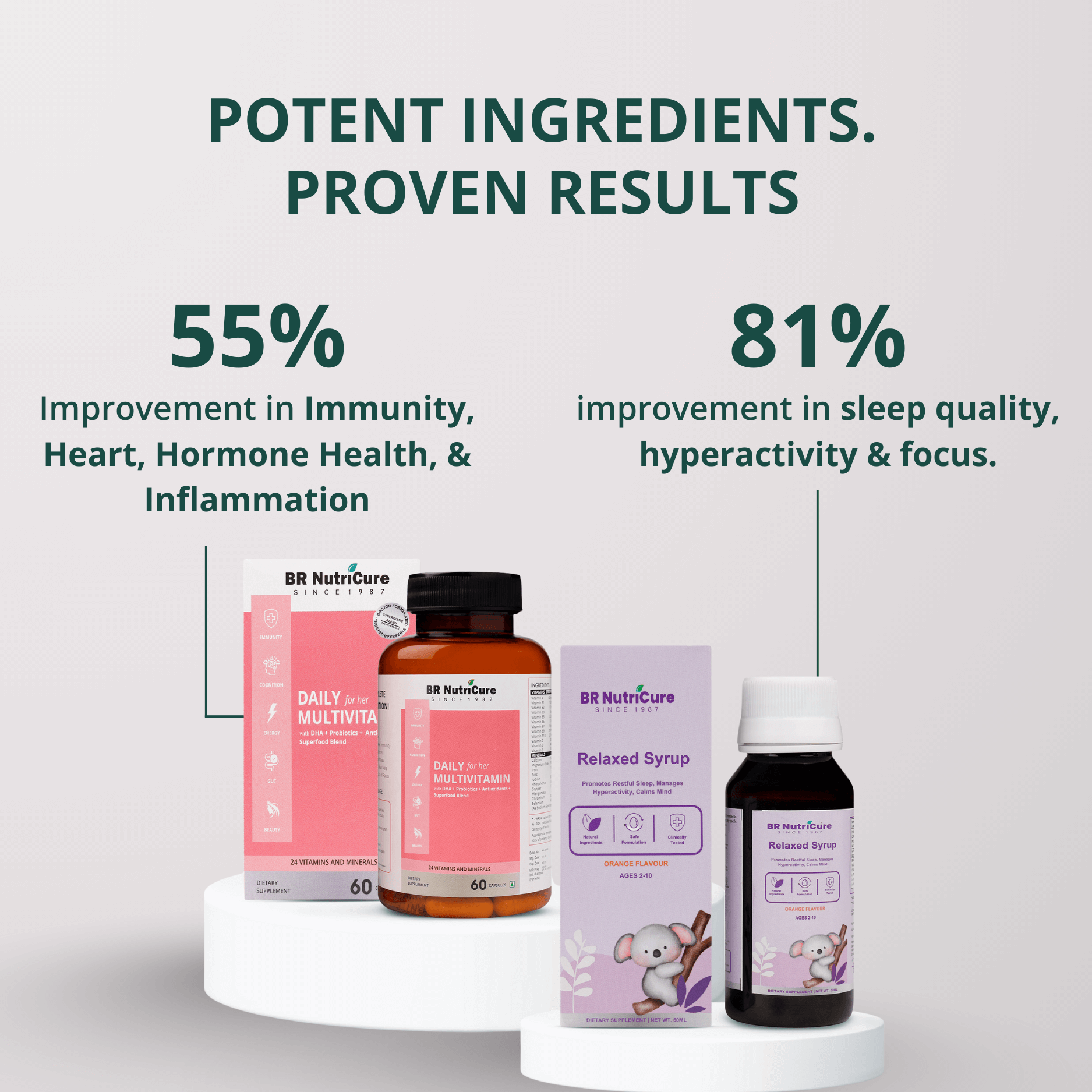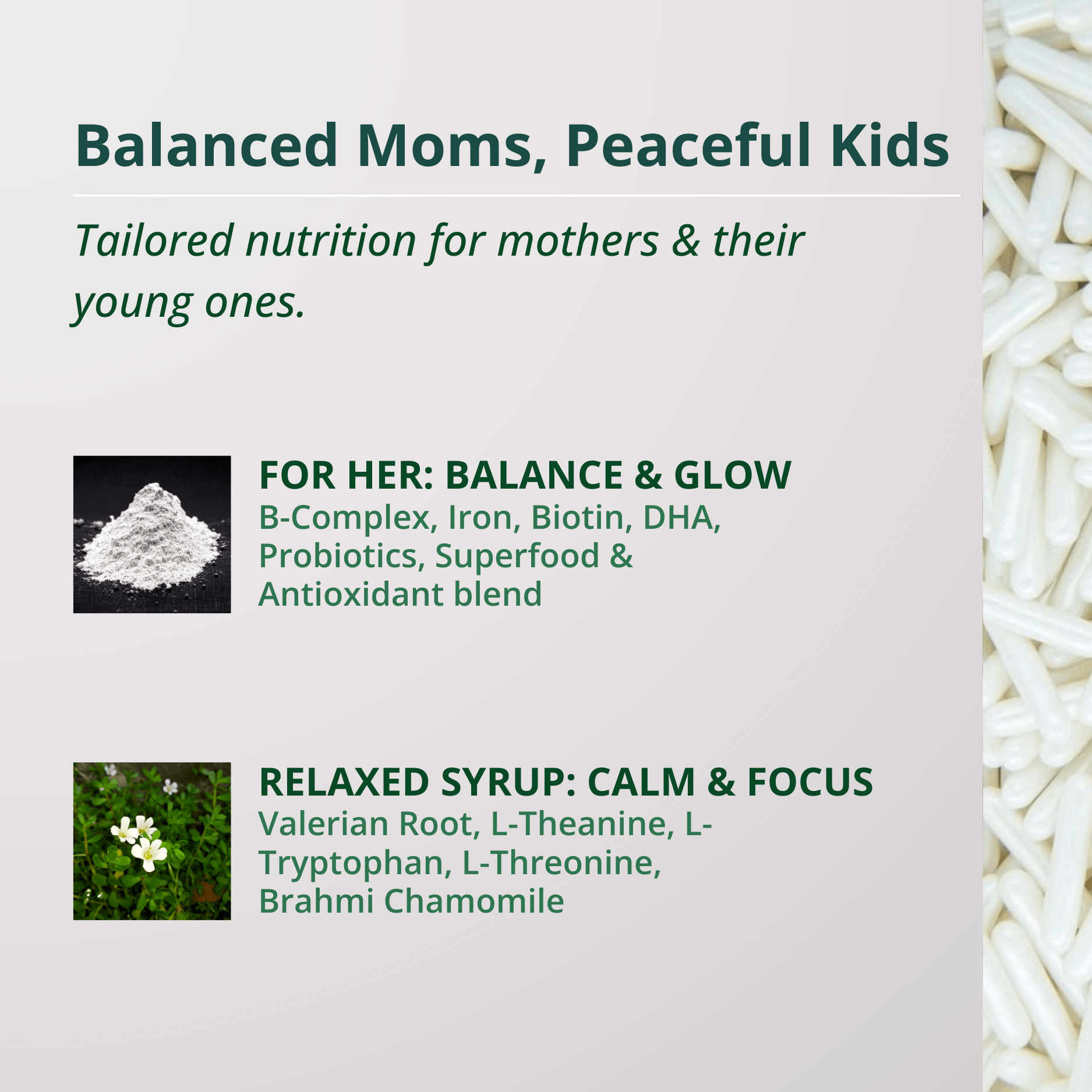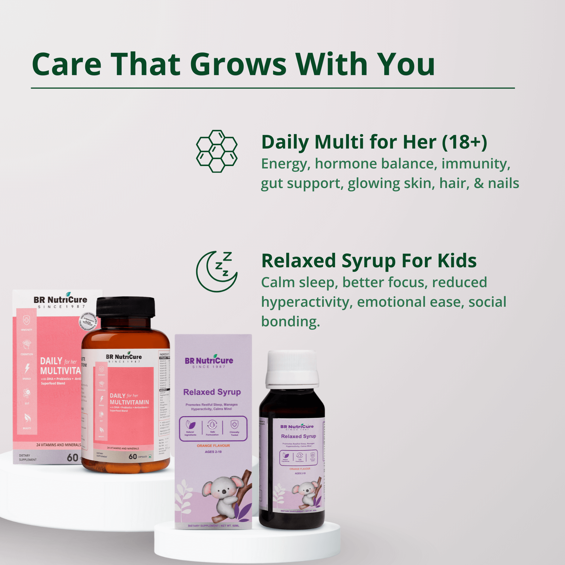 This bundle is for mothers who want to take care of their own health & also support their child’s growth and emotional balance. The Daily Multivitamin for Her helps you stay energized, balanced, & nourished, while Relaxed Syrup gently supports your child’s sleep, focus, and calmness. Together, they make it easier to prioritize both your well-being and your child’s.
