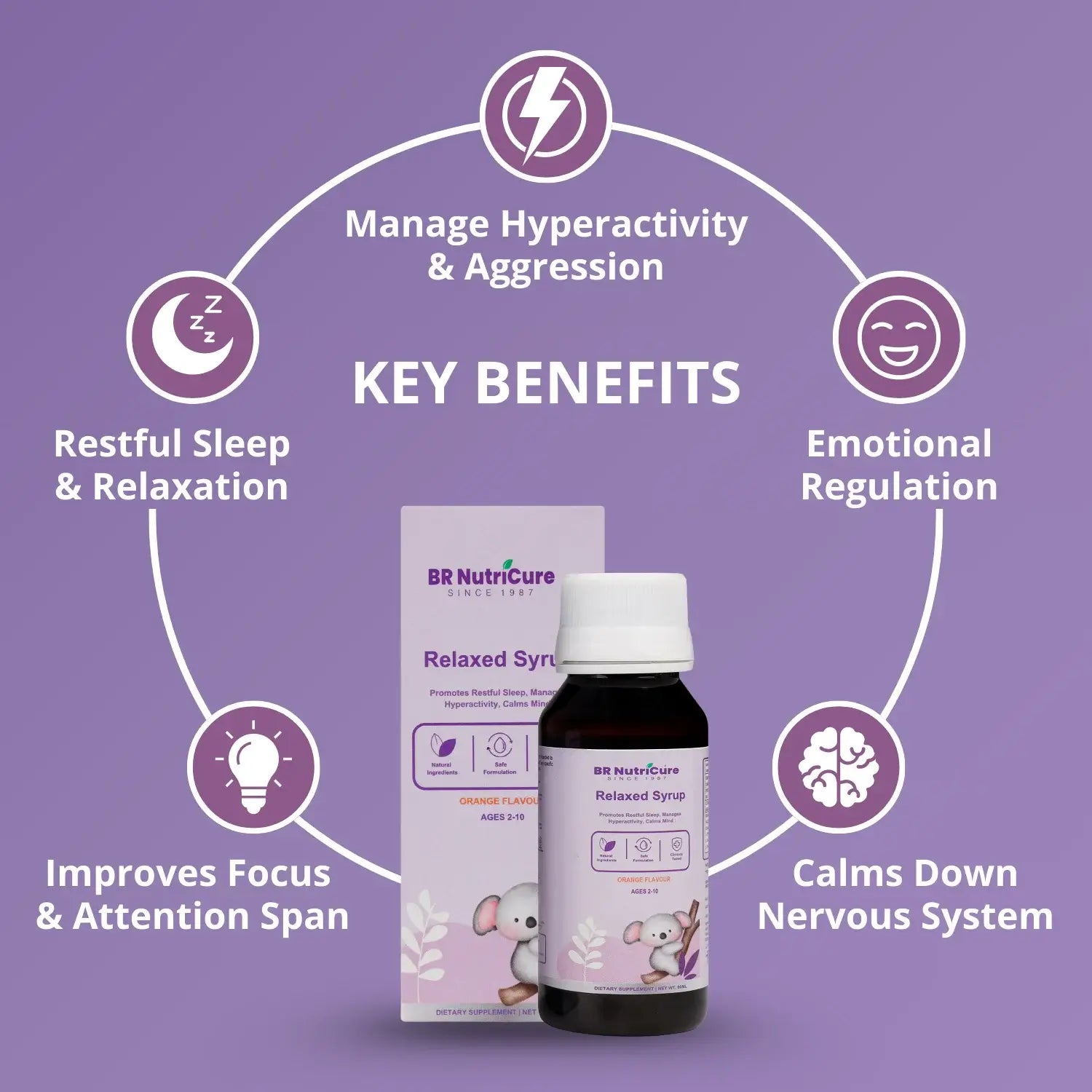 BR NutriCure Relaxed Syrup promotes a calm, focused mind, supports emotional and social development, and enhances learning ability in children aged 2–10. It is formulated with natural ingredients known for their calming and cognitive-enhancing properties.