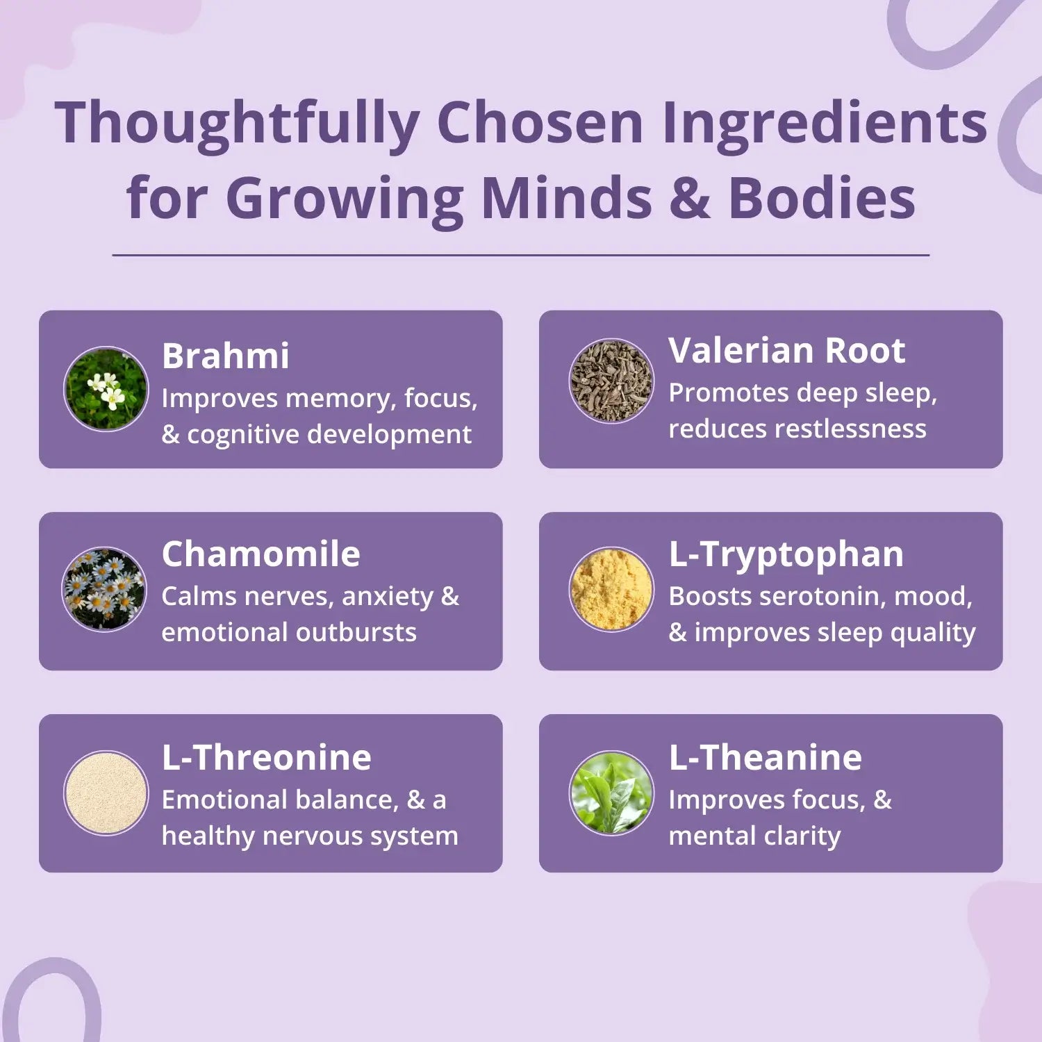 Calming amino acids, plant extracts, & brain boosting herbs like Valerian Root and L-Tryptophan to boost melatonin & GABA production to promote longer non-REM sleep, while L-Theanine & Chamomile calm brain activity and reduce hyperactivity. Brahmi supports neural development for better memory and focus.